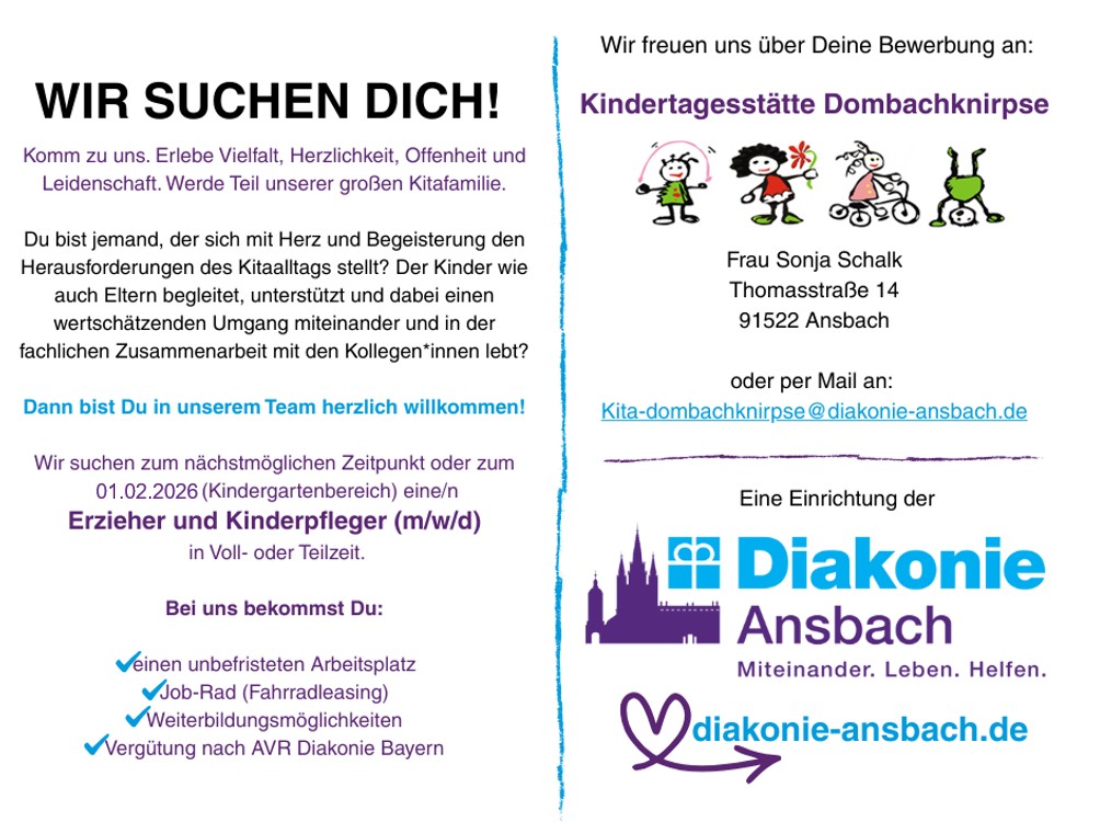 | 25.02.2026 | Veranstaltung der Kita Dombachknirpse in den Kammerspielen Ansbach mit dem Erziehungsexperten Jan-Uwe Rogge Thema: „Kinder sind doch was Schönes – sagen sie!“ Beginn: 19:00 Uhr Kartenvorverkauf startet Ende November in unserer Kita Kosten für Eltern der Kita: 19,00 Euro Kosten für alle anderen: 20,00 Euro |